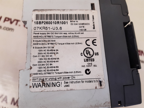 Abb 07kr51-u3.6 advant controller 31 1sbp260010r1001 basic unitabb07kr51-u3.607kr51advant controller 31basic unit6 relay outputs1sbp260010r1001power supply 24v dc 5w/10wawg 14cu str60'c torque 4.5lbs-inch(0,5nm)8 inputs 0-24v dc 5maawg 14-24cu str60'c torque 4.5lbs-inch(0,5nm)6 outputs 24v dc 2a120v ac 50-60hz 2a230v ac 50-60hz 2acom c1 24v dc 4a120v ac 50-60hz 4a230v ac 50-60hz 4acom c2 24v dc 8a120v ac 50-60hz 8a230v ac 50-60hz 8a120-230made in franceweight : 390 gm