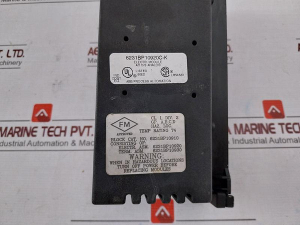 Abb 6231Bp10920C-k Analog I/O Electronic Module 24/48 Vdc 6231Bp10920Abb Process AutomationAsea Brown BoveriTaylorGe FanucMod 300Current Source Analog In/Out(115V 50/60Hz Or 125 Vdc .25A Max.)50Ma Pt/MaxLabel: 44B716223-021R04Electr.Module Ac C/S Analog6231Bp10920C-kTemp Rating T4Block Cat. No: 6231Bp10910Consisting Of:Electr.Asm: 6231Bp10920Term.Asm: 6231Bp10930Bus Switching ModuleCat.No: Ic660Bsm02124/48 Vdc9433Made In U.S.A.Weight: 1.620 Kg