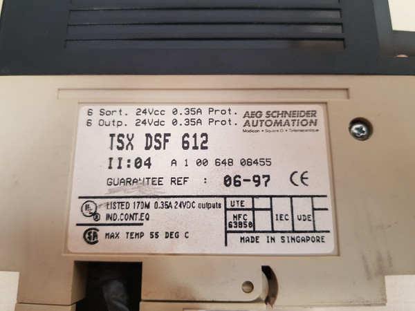 Aeg schneider tsx dsf 612 moduleaeg schneider automationmodicon square d telemecanique1a6tsx dsf 612ii: 04a 1 00 648 08455a 1 00 648 084786 sort. 24vcc 0.35a prot.6 oupt. 24vdc 0.35a prot.max temp 55 deg c12630930104105648084554p 100 amade in singaporeweight: 425 gm