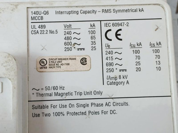 Allen Bradley 140U-q6X3 A Molded Case Circuit Breaker Frame 600 Amps Max 3-pole