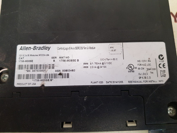 Allen-bradley 1756-m08Se Controllogix 8 Axis Sercos Servo Module 24Vdcallen-bradleysercos interfacecontrollogix 8 axis sercos servo modulecat: 1756-m08seser. b*sn 38753350*asa 00b534b2fw: 15.370 c ta +60 c--- bp: 760ma @ 5.1 vdc--- 2.5ma @ 24 vdctemp code t4cl i, div 2gp a, b, c, dproduct of usaweight: 220 gm