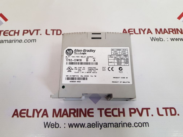 Allen-bradley  1762-ow16 micro logix 16 pt. vac/vdc relay outputallen-bradleya-b qualitymicro logix16 pt. vac/vdc relay outputcat: 1762-ow16/1762-0w16ser: b rev: aoperating temperature code t3cclass i div 2 group a,b,c,dwin (21)7m6fv5xl 459020-4022bus current draw5vdc 24vdc0.140a 0.180amax. output nemaload max. volts ics ac@50/60hz 2-125240vac c300120vac c3001440va 125vdc r15024vdc -product code 121product of malaysiaweight: 230 gm