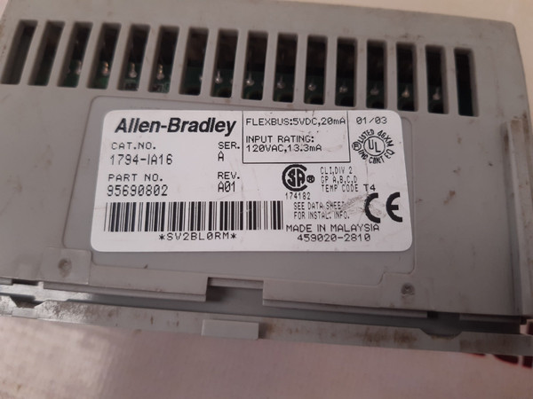 Allen-bradley 1794-ia16 Ser.A Flex I/O Input Module 95690802 Rev. A01allen-bradley(a-b) flex i/ocat.no.: 1794-ia16 ser.a120 vac inputpart no.: 95690802rev. a01sv2bl0rmflexbus: 5vdc,20mainput rating: 120vac,13.3macli,div 2gp a,b,c,dtemp code t4459020-2810made in malaysia weight : 100 gm