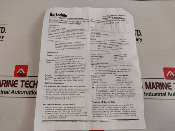 Barksdale T96211-bb5Ss-t2 96211 Compact Pressure Switch 1000 Psi 6.9 Mpa
