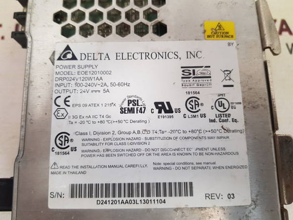 Delta Electronics Eoe12010002 Power Supply 24V-5Adelta electronics, inc.cliqpower supplymodel: eoe12010002drp024v120w1aainput: 100-240v~2a, 50-60hzoutput: 24v---5aeps 09 atex 1 215 xii 3g ex na iic t4 gcta= -20°c to +80°c (greater than +50°c derating)class i, division 2, group a,b,c,d t4,rev: 03weight: 610 gm