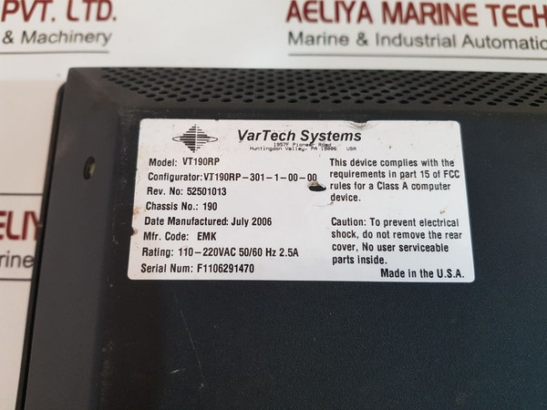 The Vartech VT190RP Display Panel is a rugged and reliable industrial-grade HMI solution, built to withstand demanding marine automation environments. Designed by Vartech Systems, this high-quality display panel delivers consistent performance in control and monitoring applications where reliability is critical. With support for a wide input voltage range (90-264V AC), robust power handling, and a corrosion-resistant chassis, the VT190RP is ideal for continuous operation in harsh conditions.