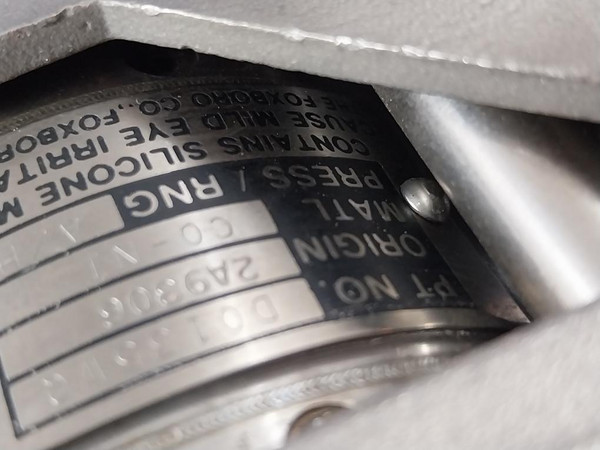 Foxboro 821Al-ds1Nh2-c Intelligent Pressure Transmitter Mep-2295 12.5-42Vdc 1.8The Foxboro CompanyFoxboro Canada Inc.Intelligent TransmitterModel: 821Al-ds1Nh2-cSt: ARef: 92480638Mep-2295Origin: 2A9315Cs: E/Fb-aMep 2259Cal: 800 Mbar AbsRng: 1400 Mbar AbsSupply Volt: 12.5-42VdcMwp: 1.8 BarAs: YOutput: 0-100 %Bo138YmSe=99-494Mv713329018Drawing: 18004WxPt No: D0135WoOrigin: 2A9306Matl: C0-niPress/Rng: A/HA182F316YpBl908Part No: L0121Fr-a820 Intelligent TransmitterSoftware Selectable Digital/4-20 Ma OutA27201633Bo138QwU.S.A.Weight: 5.620 Kg