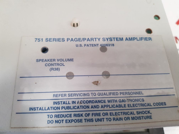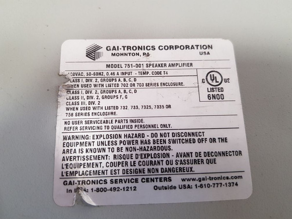 Gai-tronics 751-001 Page/Party System Speaker Amplifiergai-tronics corporationmodel 751-001 speaker amplifier120vac, 50-60hz, 0.46 a input-temp. code t4class i, div. 2, groups a,b,c,dclass ii, div. 2, groups f,gclass iii, div. 2751 series page/party system amplifieru.s. patent 4206318speaker volume control(r38)751-001 22702424usaweight: 1.730 kg