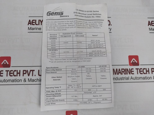 Gems Ls-2050 W/Ep Side-mounted Level Switch 6205Kpa Rev.B 316Ss 180°F