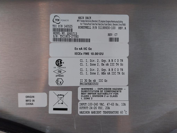 Honeywell 51199930-100 Main Power Supply Rack 800765006-a Rev.A 94V-0 20180119HoneywellMfr: Transdev Electronics (Shenzhen) LtdAstrodyneTdi PowerMain RackP/N: 51199930-100Rev.: ATdi P/N: 140525Model No.: Sps5713Rev: C7Ex Na Iic GcIecex Fme 10.0012UCl.I, Div.2, Grp. A B C D T4Cl.I, Zone 2, Ex Na Iic T4 GcCl.I, Zone 2, Aex Na Iic T4 GcIi 3G Ex Na Iic GcFm10Atex0050UClass I, Division 2 Or Class I, Zone 2Input: 100-240Vac, 47-63Hz, 10AOutput: 24-26Vdc, 20AMaximum Ambient Temperature 60˚C800765006-a20180119800768003-1Rev: D1Assy: 800790001Tdc1804-27811 S954-h0N4Rev: C5800768003-2Stm-394V-0Origin: Mfd In ChinaWeight: 2.850 Kg