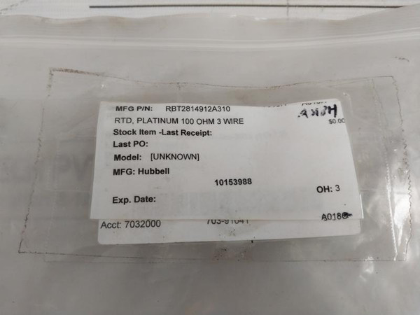 Hubbell Rbt2814912A310 Pt100 Resistance Temperature Detector (Rtd) Probe 100 OhmMfg: HubbellElectric Heater Co.Rct38-4-a9-b12-eh100-3Ecs#: 18271Mfg P/N: Rbt2814912A310Rtd,Platinum 100 Ohm 3 Wire10153988Oh: 3A0189.CmWeight: 70 Gm
