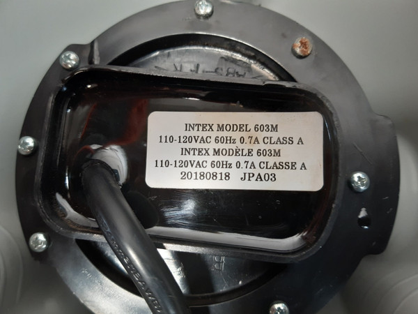 Intex krystal 603m filter pumpintex krystal clear tm filter pump model: 603110-120 v~,60 hz, 0.7a thermally protected,weatherproof enclosure,csa enclosure3,motor capacity: 0.02/name plate hp: 0.02puissance moteur asborbée/asborb motor power : 0.02/puissance moteur restituée/restored motor power : 0.0219fp603****z0intex model 603m110-120vac 60hz 0.7a class a20180818 jpa03intertek 3077995weight: 2 kg