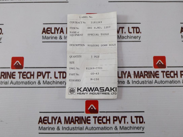 Kawasaki Gt-43 Holding Down Bolt Shi H. No. 1207 81269-7701Kawasaki Heavy Industries, Ltd.Description: Holding Down BoltName Of Equipment: Special ToolsPart No: Gt-43Item No: Shi H. No. 1207Dwg No: 81269-7701Remarks: M-150Mt Tools419-000.14360X40X20X12Xm17X1 (P/N 1)Weight: 100 Gm