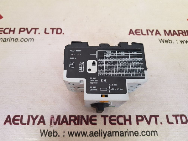 Klockner Moeller Pkzm0-1 Motor Protective Switch Circuit-breaker 600A 50/60Hzklockner moellerpkzm0-1ser.no.: 02uimp = 6000vie = 1,0 a 50/60 hziec 947en 60 947vde 0660iec 445 en 50005max rms sym amps 50 ka - 600 v ac max. fuse 600 amax.c.b. 600 atightening torque:1.8 nm/16 lb.-in awg 14- awg 10 cu 75°c wiremotor protective switch4 015080 727347made in germanyweight: 280 gm