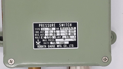 Kobata Kobata Ba-2B Pressure Switch Volt Ac 110V A.M.P. 15A Compare MSRP: $797.00 Kobata Ba-2B Pressure Switch Volt Ac 110V A.M.P. 15A kobata gauge mfg.ltd. pressure switch type : ba-2b no : 820252 inc.act. : 10 kg/cm2 off dec.act. 8 kg/cm2 on volt ac 110v a.m.p. 15a max.press. 45... Add to Cart Add to Cart Add to Wish List Add to My Wish List Create New Wish List