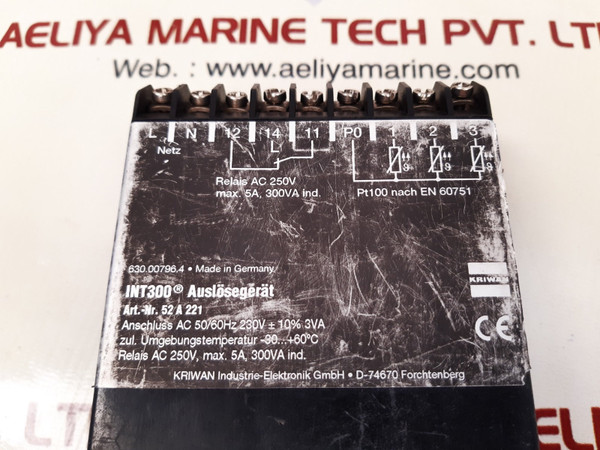 Kriwan int300 trip device 52 a 221kriwan industrie-elektronik gmbh630.00796.4int300 auslosegerat/ int300 trip deviceart. nr. 52 a 221anschluss/ connection ac 50/60hz 230v± 10% 3vazul. umgebungstemperatur/ perm. ambient temperature -30...+60°crelais/ relay ac 250v, max. 5a, 300va ind.pt100 nach en 60751/ pt100 according to en 60751einstellbereich/ adjustment range 60°...180°cmade in germanyweight: 330 gm