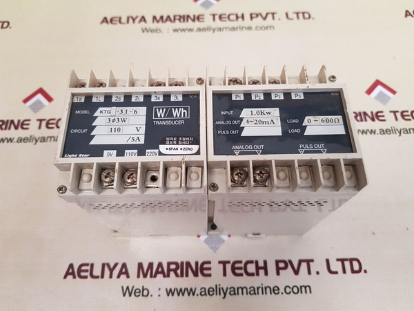 Light star ktg-31-6 transducer light starw/wh transducermodel: ktg-31-63ø3wcircuit: 110 v/5atc10input: 1.0kw3p 3wac 110v/ 5a (1 kw)1(1s), 2(1l)/ 5(3s), 6(3l)7(p1), 8(p2), 9(p3)tc11lltytransducer ktg-3161soutput: dc: 4~20ma 21(+), 22(-)class 0.2load: 0~500ωsource: ac 110v(11,12)ac 220v(11,13)ks c 1708no 99-0858tg3161s000ts04analog out 4~20maload 0~600ωweight: 950 gm