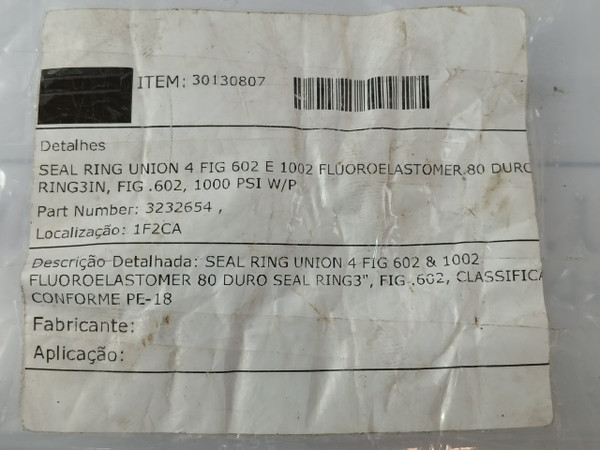 Descrição Detalhada/ Detailed Description: Seal Ring Union 4 Fig 602 & 1002 Fluoroelastomer 80 Duro Seal Ring3”, Classifica/Classification Conforme Pe-18