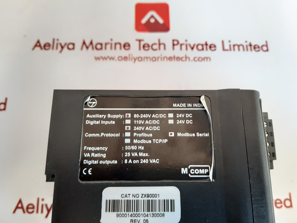 M comp zx90001 motor protection  m compltcat no zx90001auxiliary supply: 80-240v ac/dcdigital inputs: 240v ac/dccomm.protocol: modbus serialfrequency: 50/60 hzva rating : 25 va max.digital output: 8 a on 240 vac900014000104130008rev 05made in indiaweight:570 gm