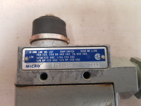 Micro switch bze6-2rn snap switch micro switchbze6-2rnsnap switch issue no.l-115l7415a-125, 250 or 480 vac; 2a-600 vac1/2a-125 vdc; 1/4a-250 vdc1/8 hp-125 vac; 1/4 hp-250 vacu.s.a. weight : 205 gm