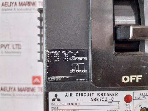 Mitsubishi Electric Abe253-c Air Circuit Breaker 50/60 Hz Ac 600V 100/0.05AMitsubishi Electric Corp.,Air Circuit BreakerType: Abe253-cRated Current (Ir): 77 APole: 3Rated Frequency: 50/60 HzRated Insulation Voltage: Ac 600VRated Operational Voltage: Ac460VAmbient Temperature: 45 °CC.T. Ratio: 100/0.05ARule: Nk 82T224Breaking Cap.(Sym.)/Making Cap.(Peak): 16/32Ka65-115% Of Ir20 Seconds At 120% Of Long-delay Pick Up (Ilp)1400% Of IrShort Time: Pick Up 300% Of IrTime 0.2 Sec. At 600% Of IrLn312N748-1Auxiliary SwitchAc 250V      10AAc 460V      5ADc 125V      0.6ADc 250V      0.3ALn316N684-3Ln420N968-5Ln420N968-4Made In JapanWeight: 6.530 Kg