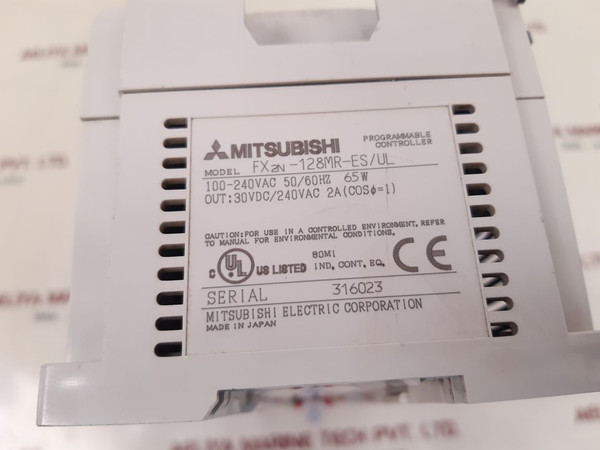 Mitsubishi fx2n-128mr-es/ul programmable controllermitsubishi electric corporation model: fx2n-128mr-es/ul128mr-es/ulprogrammable controller 100-240vac 50/60hz 65wout: 30vdc/240vac 2a(cos =1)made in japan weight : 1.630 kg