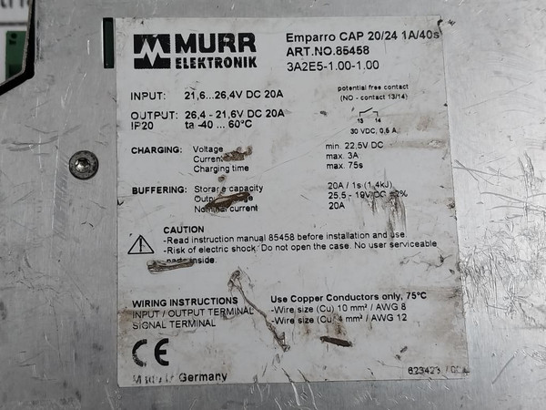 Murr Elektronik 85458 Power Supply Buffer Unit Ip20 -40...60°C 30Vdc