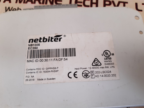 Netbiter nb1005 ec350 gatewaynetbiternb1005ec350mac id:00:30:11:fa:df:54contains fcc id: qipphs8-pcontains ic id: 7830a-phs8pfid: aainput power: 12-48vdc max 6w, lpsr 202-lsc024t ad 14-0020 202java poweredmade in sweden weight : 380 gm