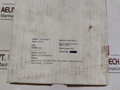 Oceaneering Oceaneering 0297360 Connector Plug 14P 16Awg Straight Compare MSRP: $397.49 Oceaneering 0297360 Connector Plug 14P 16Awg StraightManf: OceaneeringPart#: 0297360Desc: Plug, Connector, 14P, 16Awg, Straight WitXref: X200288672Mat# 454311P#: 0297360Connector Plug 14P 16Awg... Add to Cart Add to Cart Add to Wish List Add to My Wish List Create New Wish List