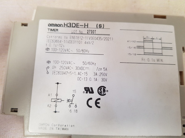 Omron H3De-h(S) Timer 250V 50/60Hz 0.1S-12Somron corporationh3de-h (s)timerconforms to en61812-1 (vde0435/2021)iec60664-1 (vde0110) 4kv/2t: 0.1s-12s100-120vac~ 50/60hzun 250vac~ 30vdc--- ith 5aiec60947-5-1, ac-15 3a: 250vdc-13 0.1a : 30vrt: 0.1s min.made in taiwanweight: 145 gm