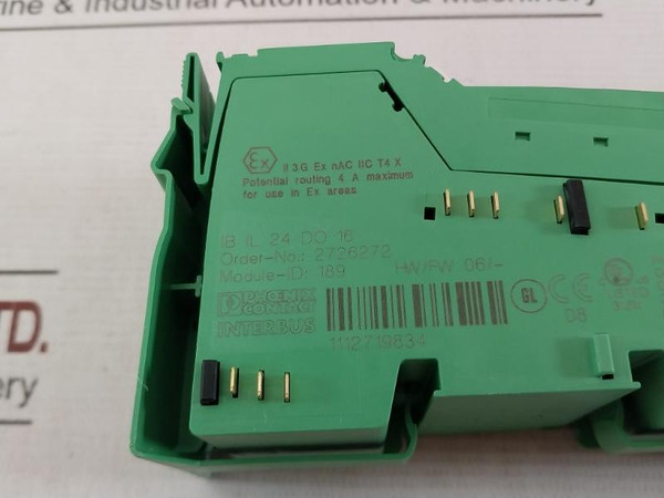 Phoenix Contact Ib Il 24 Do 16 Digital Module Potential Routing 4A Maximum 60°CPhoenix ContactInterbusIb Il 24 Do 16Order-no.: 2726272Module-id: 189Hw/Fw 06/-Ii 3 G Ex Nac Iic T4 XPotential Routing 4A MaximumCl.I, Zn.2, Aex Nc Iic T5Cl.I, Zn.2, Ex Nc Iic T5Cl.I, Div.2, Grp.A, B, C, D T5Amb.Temp.: 60°COutput: 24Vdc/500Ma1112719834250V1,5Mm2Weight: 150 Gm