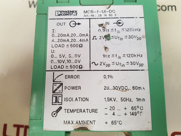 Phoenix Contact Mcr-f-ui-dc Control Module 20-30 Vdc 60Maphoenix contactmcr-f-ui-dcart.-nr: 28 14 60 5class i, div. 2, groups a,b,c,douti:0...20ma, 20...0ma4...20ma, 20...4maload 500ωu:0...5v, 5...0v0...10v, 10...0vload 500ωin0,1hz fin 120khz2vpp ufin 30vpp1hz fin 120khz.~ 2vpp ufin 30vpperror 0, 1%power 20...30vdc, 60maisolation 1,5kv, 50hz, 1m/ntemperature -20 ... + 65°c-4 ... +149°fmax.ambient + 65°cweight: 175 gm