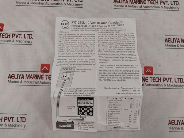Plasmatronics Pr1210L Solar Regulator 10Amp 12V 8440 14.2 VManufactured By: Plasmatronics Pty LtdSolar RegulatorPr1210L12Volt 10Amp 8440Specifications: Boost Maximum: 14.2 V Boost Cut In: 12.5 V Float Maximum: 14.0 V Float Cut In: 13.4 V All Voltages +/- 0.1 Volts Charge Current: 10 A Supply Current: 4 Ma Height: 56 Mm Width (Max): 37 Mm Depth (Max): 21 Mm Cable Entry (Dia.): 4.5 Mm Mounting Hole:  M4Weight: 60 Gm