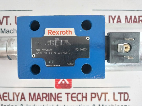 The Rexroth R900589988 is a directional control valve that ensures optimal performance and safety in directing hydraulic fluid flow within a system. Model type is 4We 10 J33/Cg24N9K4, and it weighs 4.970 kg. It operates at 24VDC with 1.45A, ensuring that the valve operates with precision and reliability on fluid flow in hydraulic systems.
