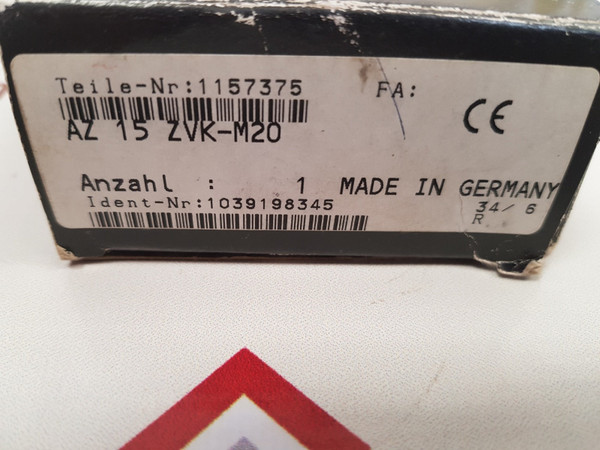 Schmersal az 15 zvk-m20 safety interlock switchschmersalaz 15 zvk-m20iec 60947-5-1 ip 67ui 500v uimp 6kv ac-15a600, type 1teile-nr/part-no: 1157375ident-nr: 1039198345made in germanyweight: 125 gm