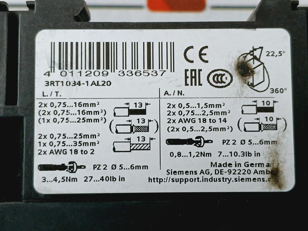 Siemens 3Rt1034-1Al20 Sirius Contactor 50A 50/60Hz