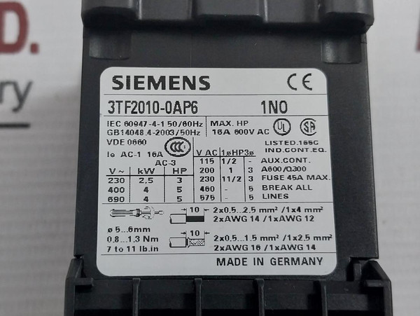 Siemens 3Tf20 10-0Ap6 Contactor 4Kw 400Vac