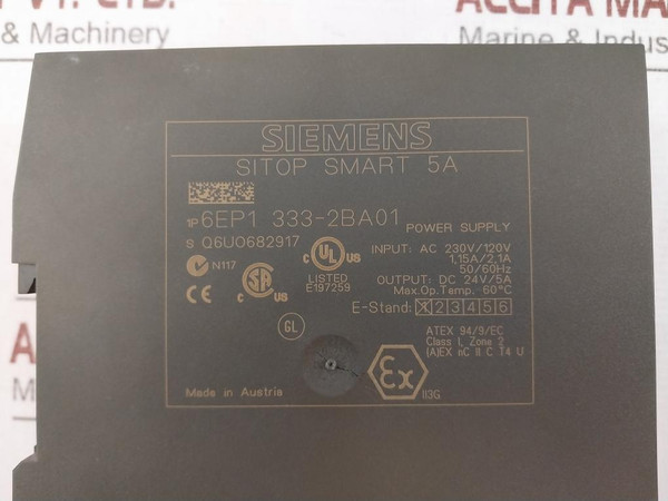 Siemens 6Ep1 333-2Ba01 Sitop Smart 5A Power Supply Module Ac 230V/120V 50/60HzSiemensPower SupplySitop Smart 5A6Ep1 333-2Ba011P 6Ep1 333-2Ba01X 2 3 4/1Q6UoInput: Ac 230V/120V1,15A/2,1A50/60HzOutput: Dc 24V/5AMax. Op. Temp. 60°CE-stand: X 2 3 4 5 6/1Atex 94/9/EcClass I, Zone 2(A) Ex Nc Ii C T4 UIi3GE197259Made In AustriaWeight: 500 Gm
