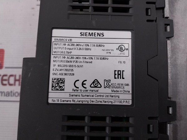 Siemens 6Sl3210-5Bb15-5Uv1 Uss/Modbus Rtu W/ Built-in Bop Protection