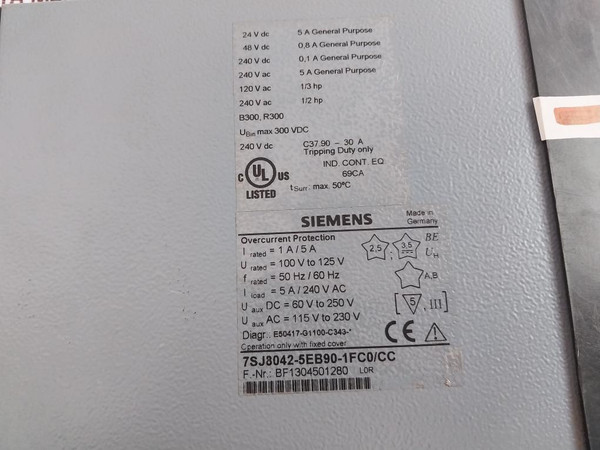 Siemens 7Sj8042-5Eb90-1Fc0/Cc Overcurrent Protection Relay 5A 240V 50Hz/60Hz