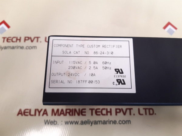 Sola electric 86-24-310 power supply 9-7493-01sola electrica unit of general signal9-7493-01cat no: 86-24-310input: 115vac/5.0a 60hz230vac/2.5a 50hzoutput: 24vdc/ 10aweight: 1.320 kg