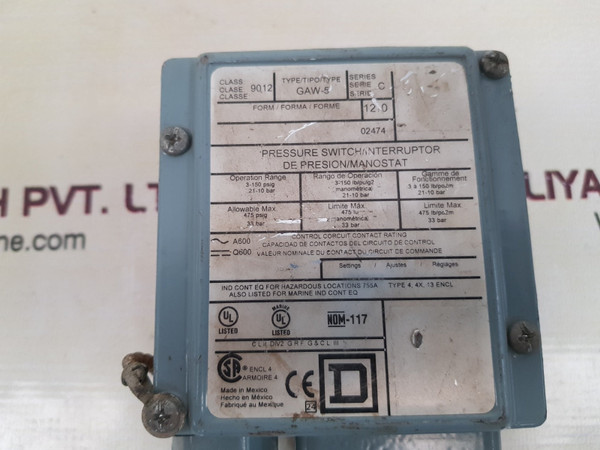 Square D 9012 gaw-5 pressure switch 3-150 psig