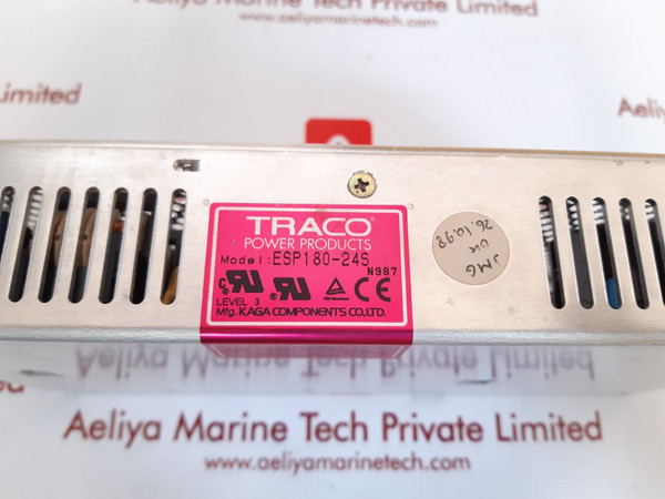 Traco esp180-24s switching power supplymfg.kaga components co., ltd.tracopower productsmodel:esp180-24sn987level 3input:100-230v~ 2.0-1.0a 50-60hzoutput:24v-8.1a(230v~ in)6.7a(100v~ in)made in japanweight:1.210 kg