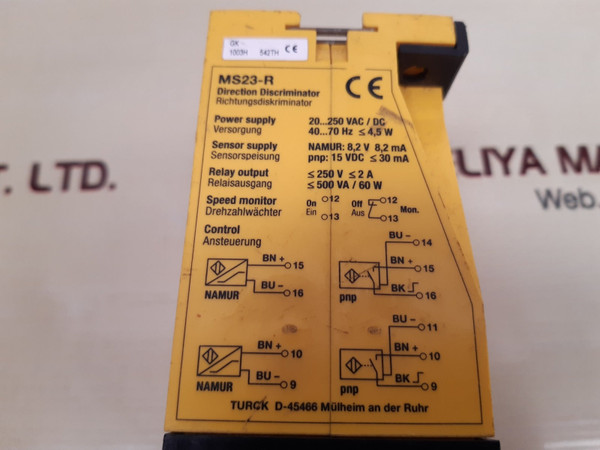 Turck Ms23-r Multi Safe Direction Discriminatorturckms23-rturck elektronik-feinbau3-10444/3-10450gk 1003h 542thdirection discriminator/ richtungsdiskriminatorpower supply: 20...250 vac/ dcversorgung: 40...70 hz 4,5wsensor supply namur: 8,2v 8,2 masensorspeisung: 15vdc 30 marelay output: 250v 2 arelaisausgang: 500 va/60 wweight: 225 gm