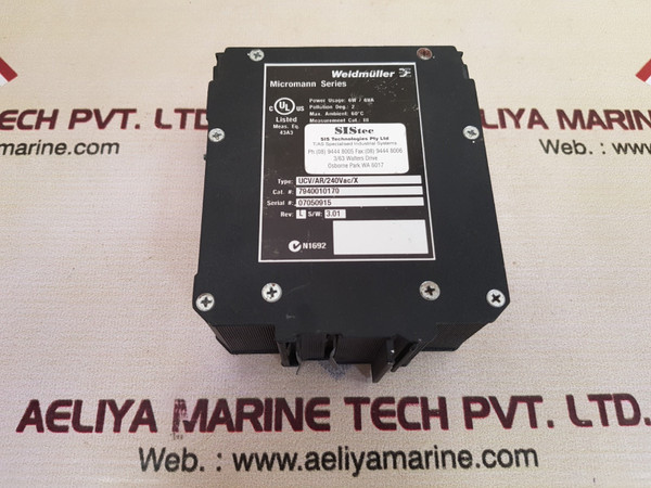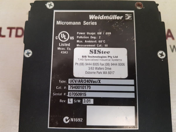 Weidmuller Ucv/Ar/240Vac/X Micromann Signal Conditioner Isolator 7940010170weidmuller sis tecsis technologies pty ltdt/as specialised industrial systemsmicromann seriespower usage: 6w/6vapollution deg.: 2max. ambient: 60°cmeasurement cat.: iiitype: ucv/ar/240vac/xcat#.: 7940010170rev: l s/w: 3.013f1ly018b/3f1lyoi9bucv/ar24vdc (out)neutral./- 240vacrating: 3a240vac/30vdcanalogue outputweight: 595 gm