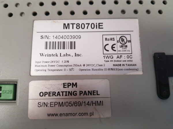 Weintek Mt8070Ie Operating Touch Screen Panel Temp 0-50°Cenamor ltd.high level engineeringepm-electric power monitorweintek labs., inc.mt 8070ieinput power: 24vdc ±20%maximum power consumption: 350ma @ 24vdc, class 2operating temperature: 0~50°coperation humidity: 10-90% rh (non-condensing)1wg af: 0ctype 4x (indoor use only)epmoperating panelmade in taiwanweight: 582 gm
