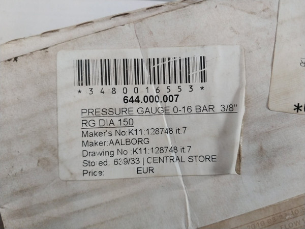 Wika En 837-1 Pressure Gauge 0-16 Bar 3/8 Inch RgWika Alexander Wiegand Se & Co. Kg.Alfa LavalMaker: AalborgDesc: Pressure GaugeEn 837-10-16 BarCl 1.0Swiss Movement41318261813/8” Rg Dia 150644.000.007Maker’s No/ Drawing No:  K11: 128748 It.7*3480016553*Al Item No: Ag2914128Suffix No.: 002Country Of Origin: PolandWeight: 1.280 Kg